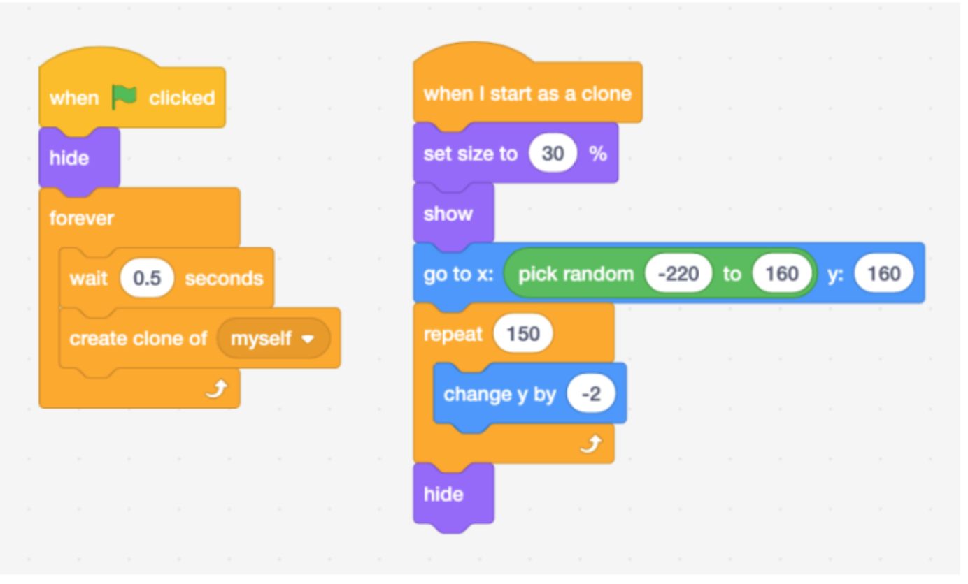 6. For the backdrop, we are going to make clones of the heart fall from the sky. Build the below code by dragging blocks into the empty code area for your heart.